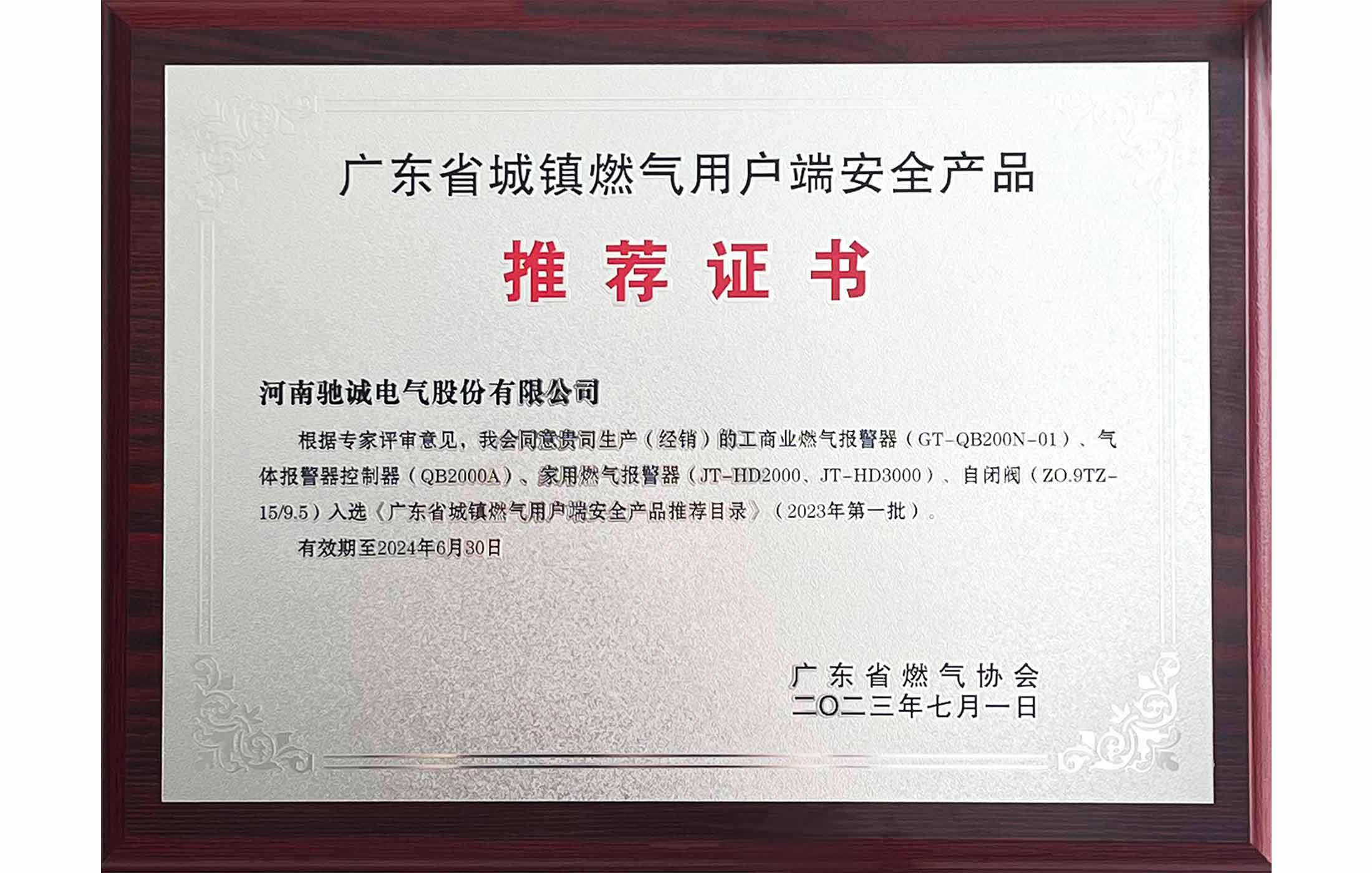 廣東省城鎮(zhèn)燃氣用戶端安全產(chǎn)品推薦證書