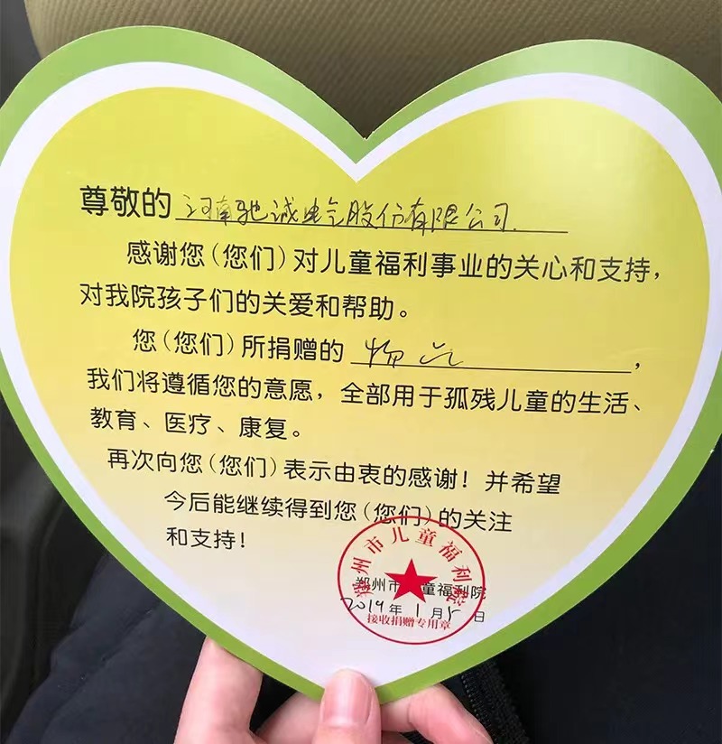 馳誠電氣牢記企業(yè)責(zé)任與社會(huì)責(zé)任,先后參與了“兒童福利院愛心捐助”、“抗震救災(zāi)”、“防疫愛心捐助”、“抗洪救災(zāi)”、“愛心助學(xué)”等多項(xiàng)公益事業(yè),用自己的涓滴之力,為社會(huì)發(fā)展做貢獻(xiàn)!